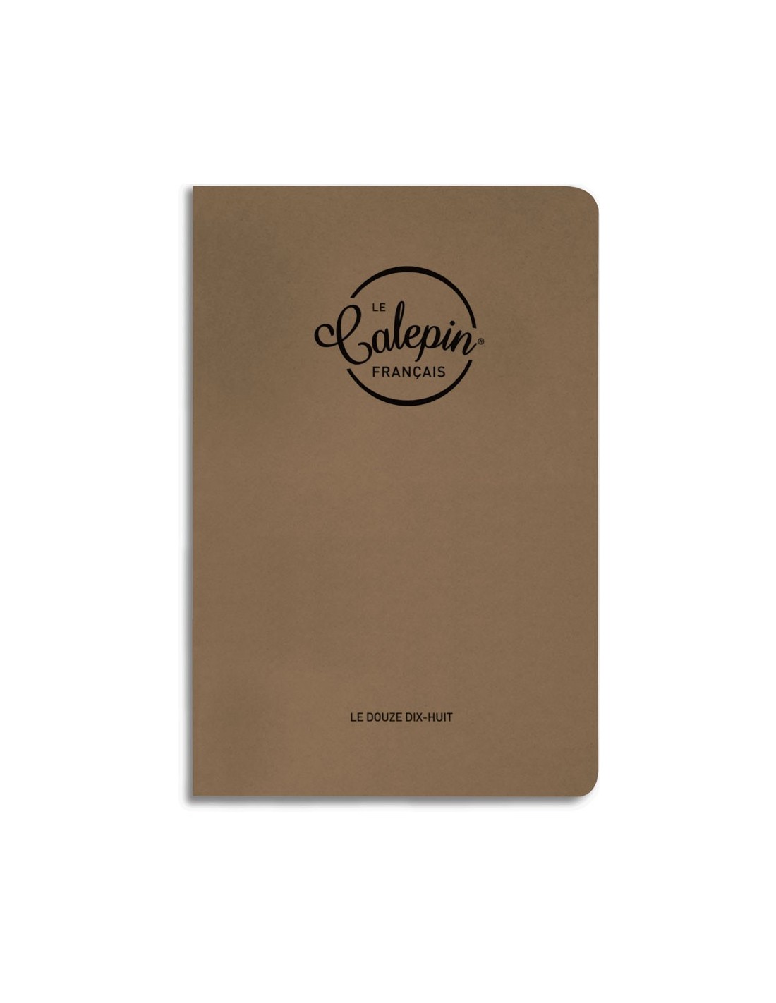 Sur la première page de couverture est imprimée en noir le logo du Calepin Français et le format et au dos « Ce carnet est conçu et imprimé en France » avec notre adresse.