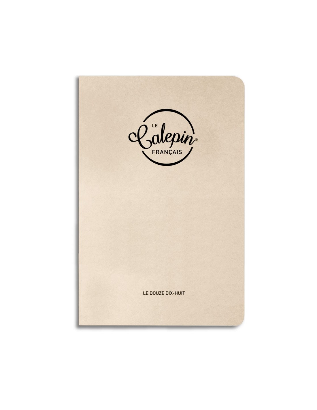 Sur la première page de couverture est imprimée en noir le logo du Calepin Français et le format et au dos « Ce carnet est conçu et imprimé en France » avec notre adresse.